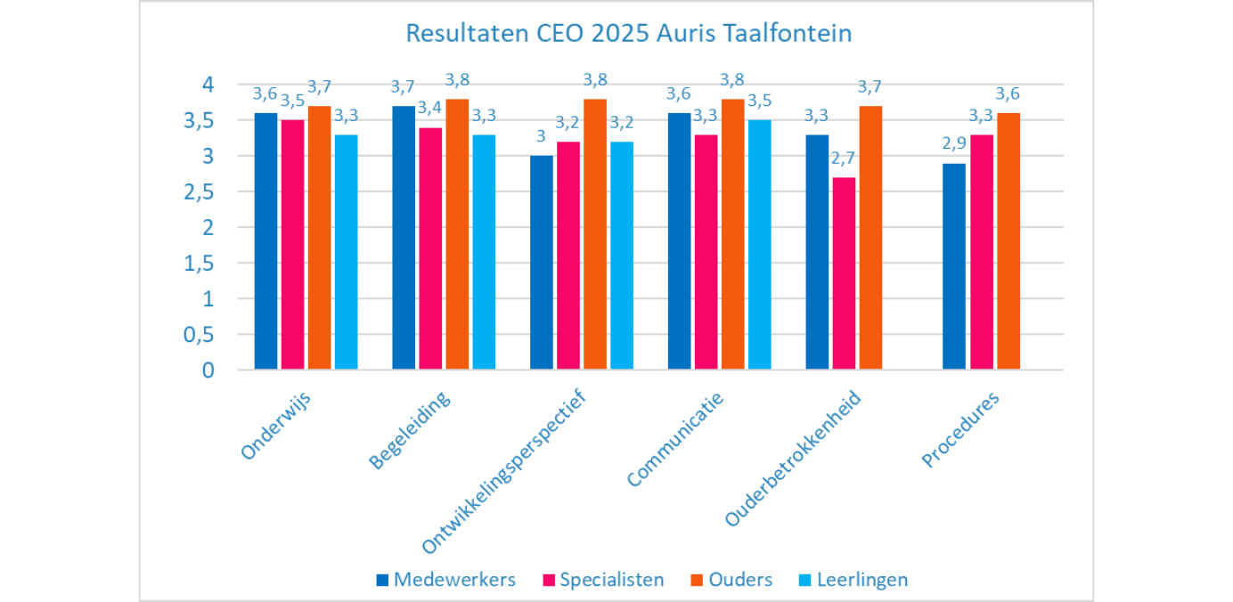 De leerresultaten van Auris Taalfontein worden op schoolniveau verzameld. De gegevens leggen we naast de vastgestelde ambitie schoolstandaarden. Voor de groepen 1-2 gebruiken wij Mijn Kleutergroep om de ontwikkeling van de leerlingen te volgen en voor de groepen 3 t/m 8 gebruiken wij Leerling in Beeld (Cito).
