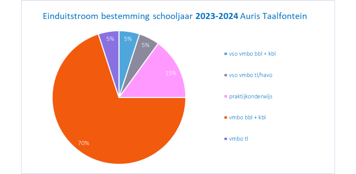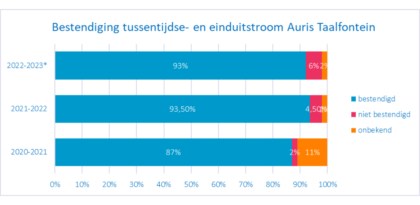Auris houdt bij naar welk niveau onze leerlingen uitstromen. Ook wordt bijgehouden of leerlingen twee jaar na het uitstromen nog steeds op dezelfde bestemming zitten (bestendiging). Deze gegevens worden jaarlijks door de Onderwijsinspectie uitgevraagd over het afgelopen schooljaar.
